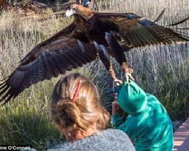 ஆஸ்திரேலியாவில் ஆலிஸ் ஸ்பரிங் பாலைவனப் பூங்காவில் வன விலங்குகள் கண்காட்சி நடந்தது. அதை கண்டு களிக்க ஏராள மானோர் கூடியிருந்தனர் அப்போது அங்கு அசுர வேகத்தில் பறந்து வந்த ஒரு கழுகு தனது கூரிய கால்களின் நகங்களால் ஒரு சிறுவனை தூக்கி செல்ல முயன்றது.